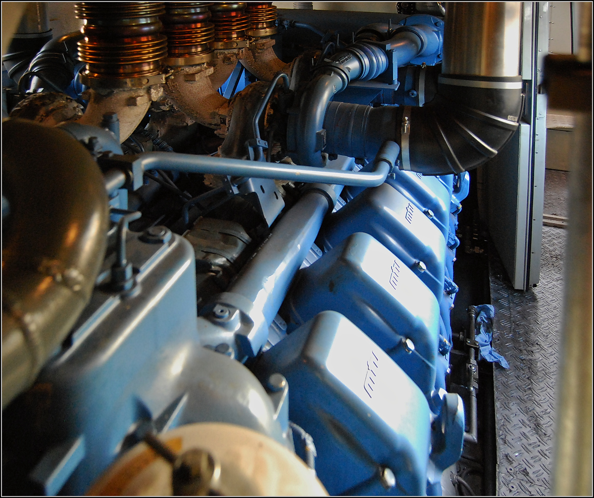 seit 2009: 2 Stück MTU - Motoren- und Turbinenunion (Friedrichshafen), Typ 12V 4000 R41, ein wassergekühlten V12-Zylinder-Dieselmotor mit Abgasturbolader und Ladeluftkühlung, mit einem Hubraum von 57.199 cm³ bzw. 57,2 Liter (Bohrung 170 mm x 210 mm Hub) und einer Leistung von je 2.000 PS.