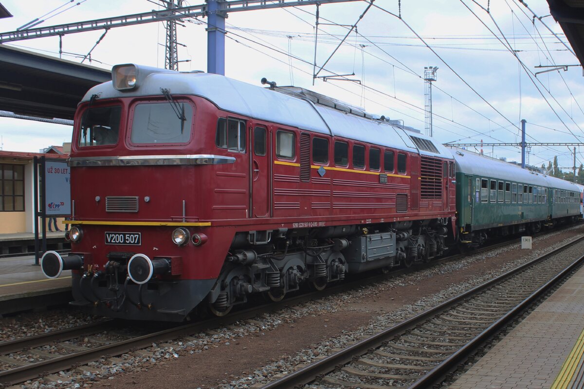 EBS V 200 507 ist drie Jahre nach den Erstauftritt in Benesov u Prahy wieder dort zu Gast und schiebt am 27 September 2025 eine der 25 Sonderzüge des Tages aus Benesov u Prahy während das Bahnfest STEAM56.