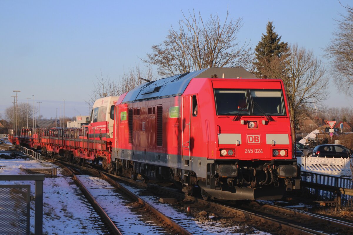 Vom hinter der Bahnübergang wurde am 14 Februar 2026 DBAZ 245 024 mit deren Sylt-Shuttle beim einfahren in Niebüll fotografiert.