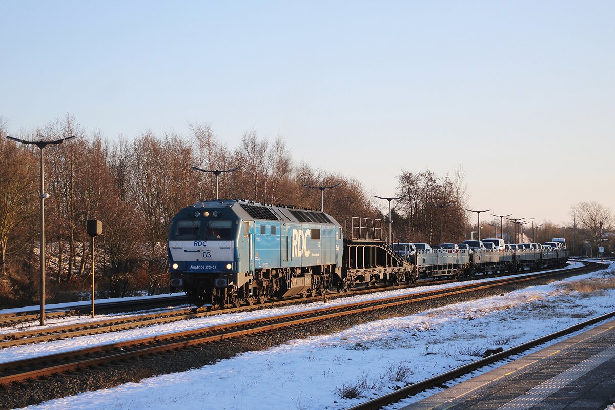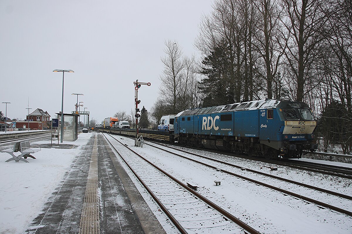 RDC DE 2700-07 schiebt, schmüztig und stark, ein RDC Autozug aus Niebüll nach Westerland (Sylt)  am 16 Februar 2026. Schiebediensten an Syltshuttles und RDC Autozüge sind jedoch etwas rares...