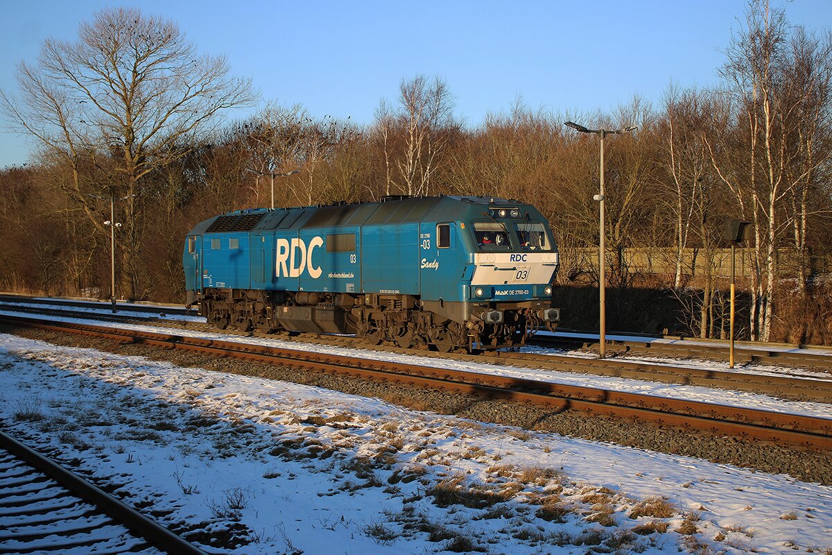 RDC DE 2700-07 schiebt, schmüztig und stark, ein RDC Autozug aus Niebüll nach Westerland (Sylt) am 16 Februar 2026. Schiebediensten an Syltshuttles und RDC Autozüge sind jedoch etwas rares... Leon Schrijvers