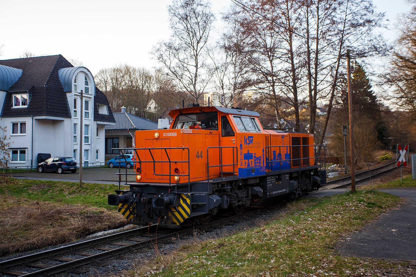 Die beiden Vossloh G 1000 BB der KAF Falkenhahn Bau AG fahren in Doppeltraktion am 14 März 2025 mit einem Bauzug/Schotterzug, bestehend aus KAF Kippwagen MK 45 DH „LW-Kipper“ der Gattung Rlps und am Zugende Flachwagen der Gattung Gattung Slmns1, durch den Bahnhof Kirchen/Sieg in Richtung Köln. Vorne die 271 022-6 „Charlotte“ (92 80 1271 022-6 D-KAF), ex MRCE bzw. ex HGK DH 49 und dahinter die 271 006-9 „Julius“ (92 80 1271 006-9 D-KAF)