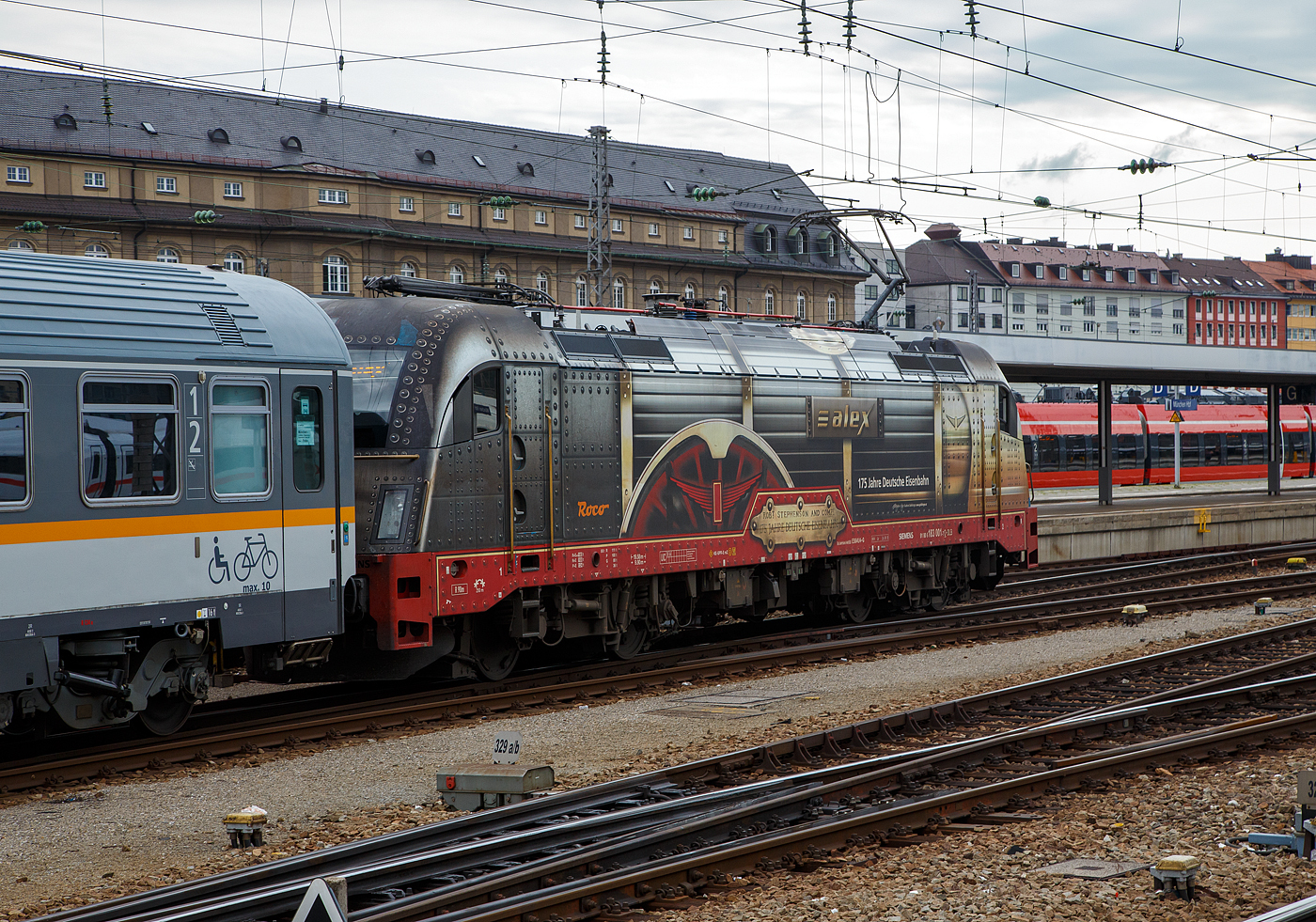 Die wunderschöne ALEX Lok 183 001-7 (91 80 6183 001-7 D-DLB) "175 Jahre Deutsche Eisenbahn" schiebt am 06 Juni 2019 einen ALEX-Zug aus den Hbf München in die Abstellgruppe. Das Design ist von der Österreicherin Gudrun Geiblinger und angelehnt an die Lokomotive "Adler" Die Siemens ES64U4 (wie ÖBB Taurus III) wurde 2007 von Siemens in München unter der Fabriknummer 21130 gebaut. Eigentümer ist HANNOVER LEASING GmbH & Co. KG in Pullach und der Fahrzeugnutzer (Mieter) ist Die Länderbahn GmbH (DLB). Die Elektrolokomotiven der Baureihe BR 183 (Siemens ES64U4 bei der ÖBB auch Taurus III genannt), sind Mehrsystem-Drehstrom-Universallokomotiven, die auf der Technik der Siemens-EuroSprinter-Typenfamilie basieren. Seit 2006 werden die Loks im grenzüberschreitenden Planverkehr eingesetzt. Die ÖBB besitzen derzeit 50 Lokomotiven, davon hält die letzte mit 357 km/h den Geschwindigkeits-Weltrekord für konventionelle Elektrolokomotiven.