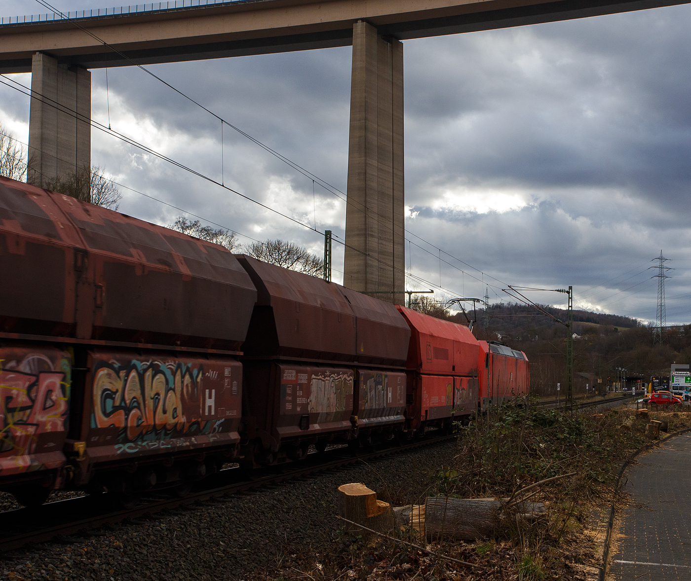 185 376-1 (eine Bombardier TRAXX F140 AC2 und somit eine BR 185.2) zieht einen gemischten Güterzug, auf der Siegstrecke (KBS 460) in Richtung Köln, hier am 27.10.2012 kurz vor dem Bahnhof Betzdorf/Sieg (bei km 122,8).