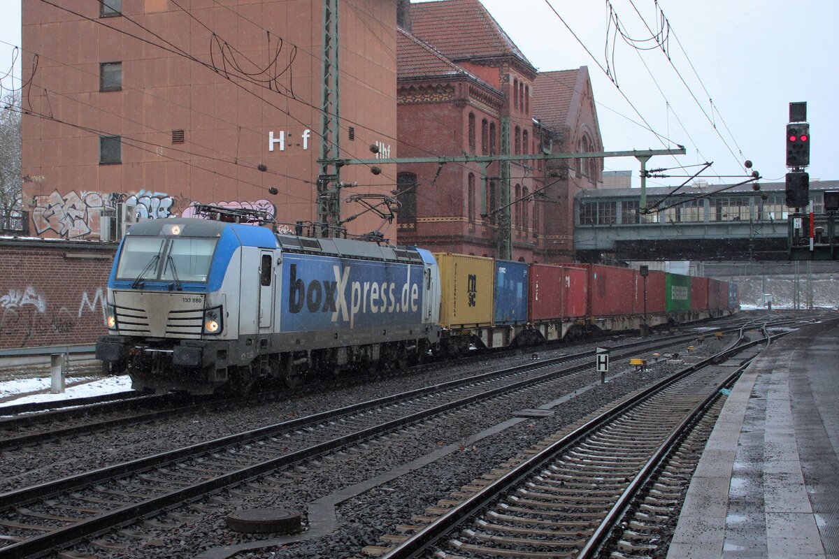 Die an die österreichische Weco Rail / Wenzel Logistics vermietete „weiße“ SIEMENS Vectron AC – 193 011-4 (91 80 6193 011-4 D-ELOC) der ELL - European Locomotive Leasing (Wien) fährt am 05 März 2026 mit einem KLV-Zug durch Siegen-Eiserfeld in Richtung Köln.