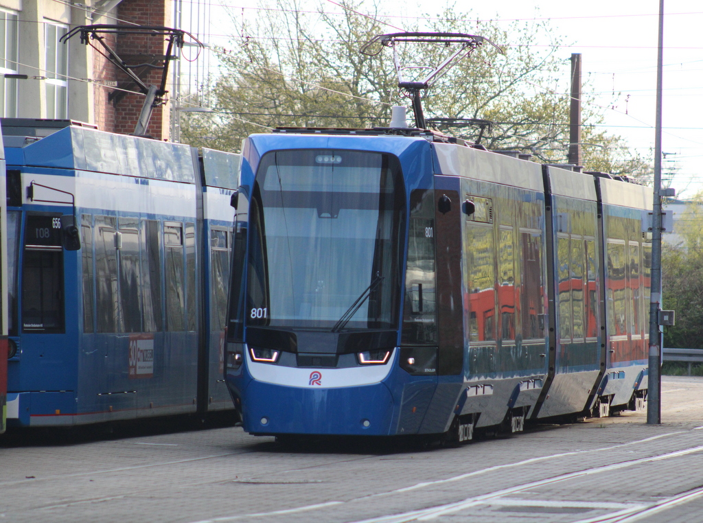 RSAG-Wagen 801 Tina  stand am Vormittag des 18.04.2026 auf dem Betriebshof der Rostocker Straßenbahn AG.