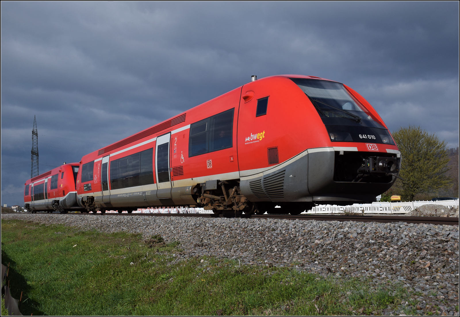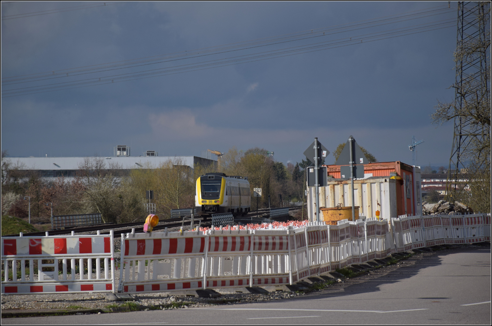 641 010 und 641 031 fahren rheinaufwärts durch Warmbach. Die Baustelle für den künftigen Haltepunkt ist bereits deutlich sichtbar. März 2026.