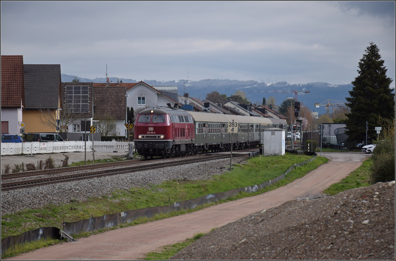 Dieselabschiedsfahrt am Hochrhein. 218 155 mit vielen geneigten Fahrgästen im Zug der EFZ fährt nach Basel. Die Lok wie aus der Märklinschachtel, den Hotzenwald im Rücken geht es hier durch die Baustelle für den neuen Haltepunkt Warmbach. März 2026.