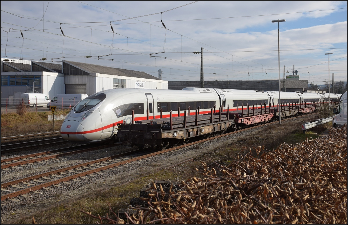 Das erste Exemplar der BR 408 Efringen-Kirchen. Tfz 8001 wurde leider von einem dort ebenso geparkten Güterzug in den Schatten gestellt. Januar 2022.