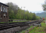 Die KSW 43 (92 80 1273 018-2 D-KSW) der KSW (Kreisbahn Siegen-Wittgenstein), fährt am 28.01.2022 mit einem langen Übergabezug über Gleis 4 durch den Bahnhof Herdorf. Noch hat sie kurz Hp 0 bevor es gleich via Betzdorf (Sieg) nach Kreuztal geht.