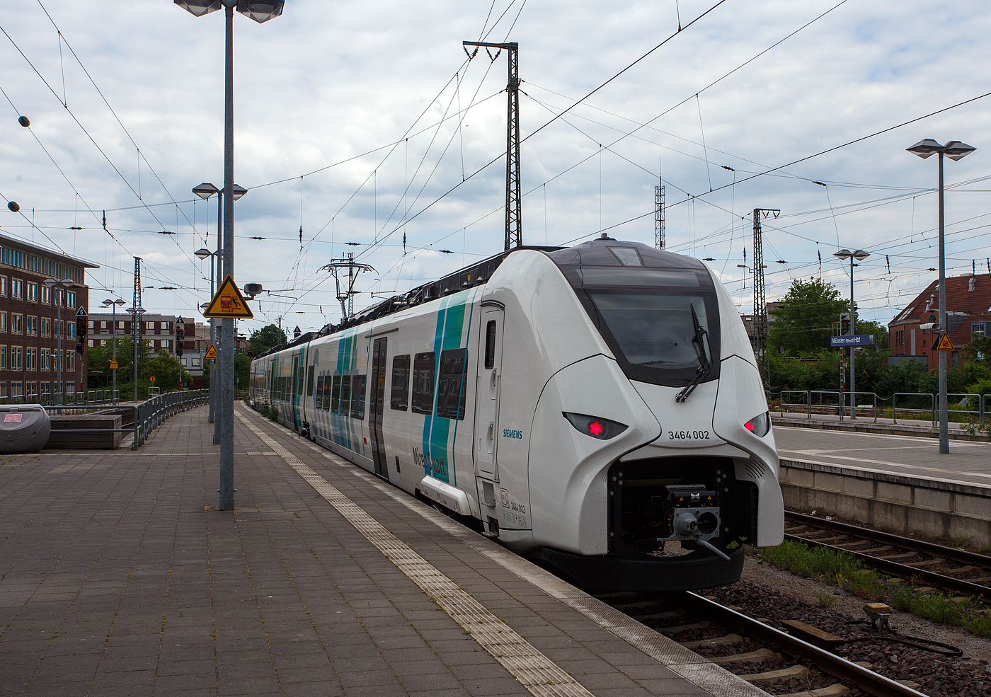Der dreiteilige Siemens Mireo Smart 3464 002 / 3464 202 / 3464 102 (94 80 3464 002-9 D- SIEAG / 94 80 3464 202-5 D-SIEAG /94 80 3464 102-7 D-SIEAG) der Siemens Mobility GmbH fährt am 20 Mai 2025 durch den Hauptbahnhof Münster (Westfalen) in nördlicher Richtung.