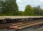 4-achsiger Drehgestellflachwagen, mit Stahlboden, Seiten-, Stirnwandklappen und mit UIC-Drehrungen, TEN 37 80 3988 296-4 D-ERD, Gattung Rens 192 B, der Eiffage Infra- Rail, am 18.08.2019 im Zugverband in Wilnsdorf-Rudersdorf.
