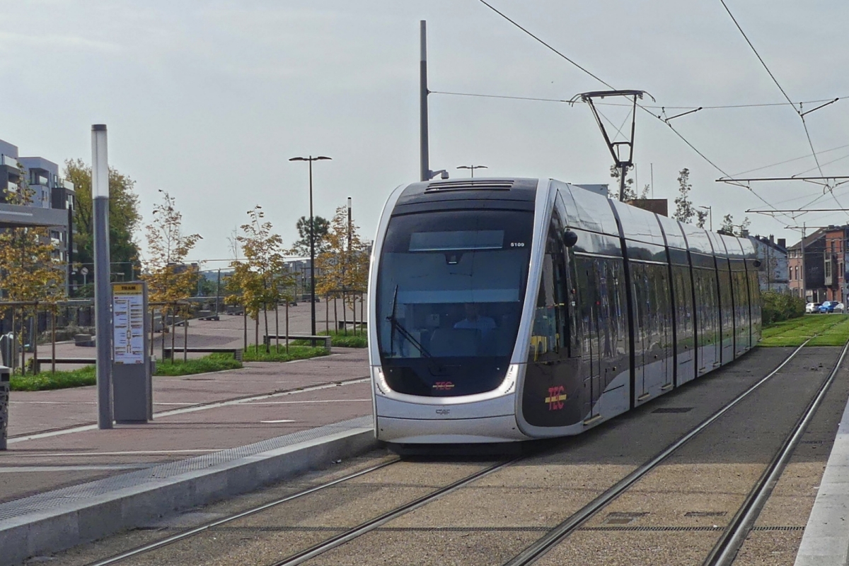 Straßenbahn Lüttich der Triebwagen TEC 5115, ein siebenteiliger niederfluriger, klimatisierter Zweirichtungs-Straßenbahnwagen des Typs CAF Urbos 100 des spanischen Herstellers Construcciones y Auxiliar de Ferrocarriles (CAF), erreicht als Linie T1 nach Standard, am 21 Oktober 2025 bald die Station Marengo. Hier verläuft die Strecke entlang der Maas.