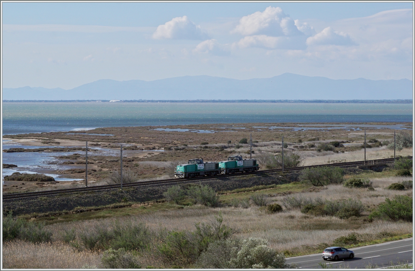 Zwischen Narbonne und Perpignan sind diese beiden SNCF Cargo Diesellok BB 60021 und 60052 von Vossloh España unterwegs.