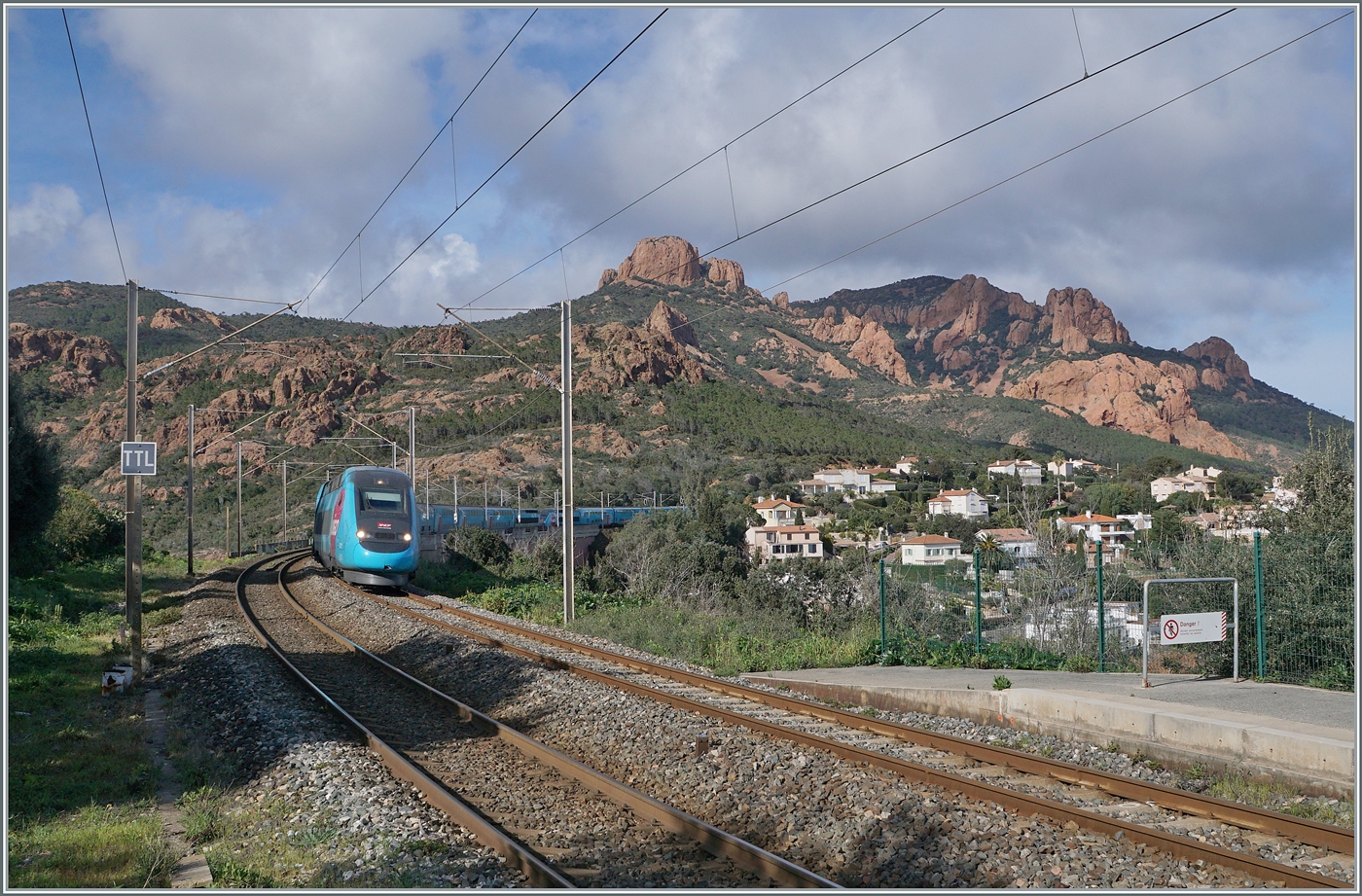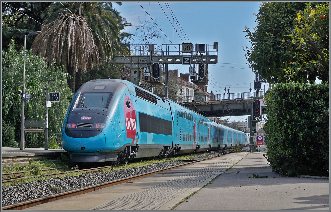 Der inoui TGV 6504 wartet in der Zugsausgangsstation Evian les Bains auf die Abfahrt nach Paris Gare de Lyon um 13:18. Der Zug bestehend aus dem Euroduplex Rame 804.