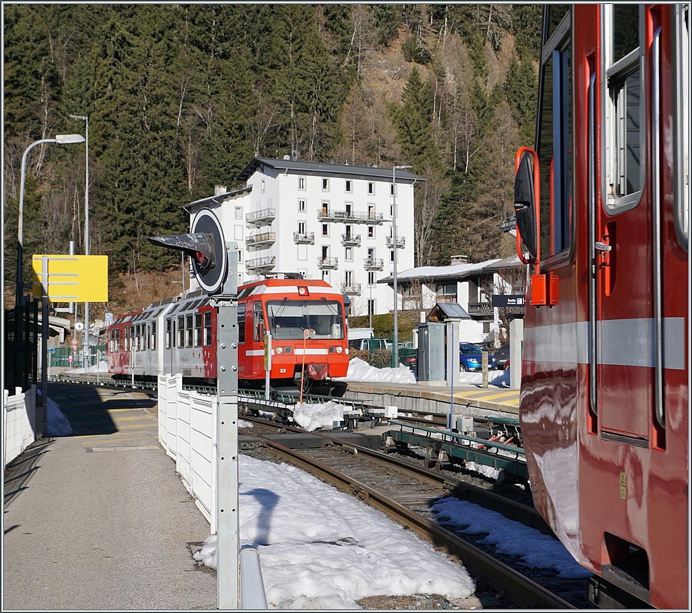 Während der TMR BDeh 4/8 22 als TER 18914 von Vallorcine nach Saint-Gervais-Bains in Montroc-le-Planet angekommen ist, trifft der Gegenzug, der SNCF Z 800 003 (94 87 0000 806-3) als TER 18959 von Les Houches nach Vallorcine unterwegs gerade ein.