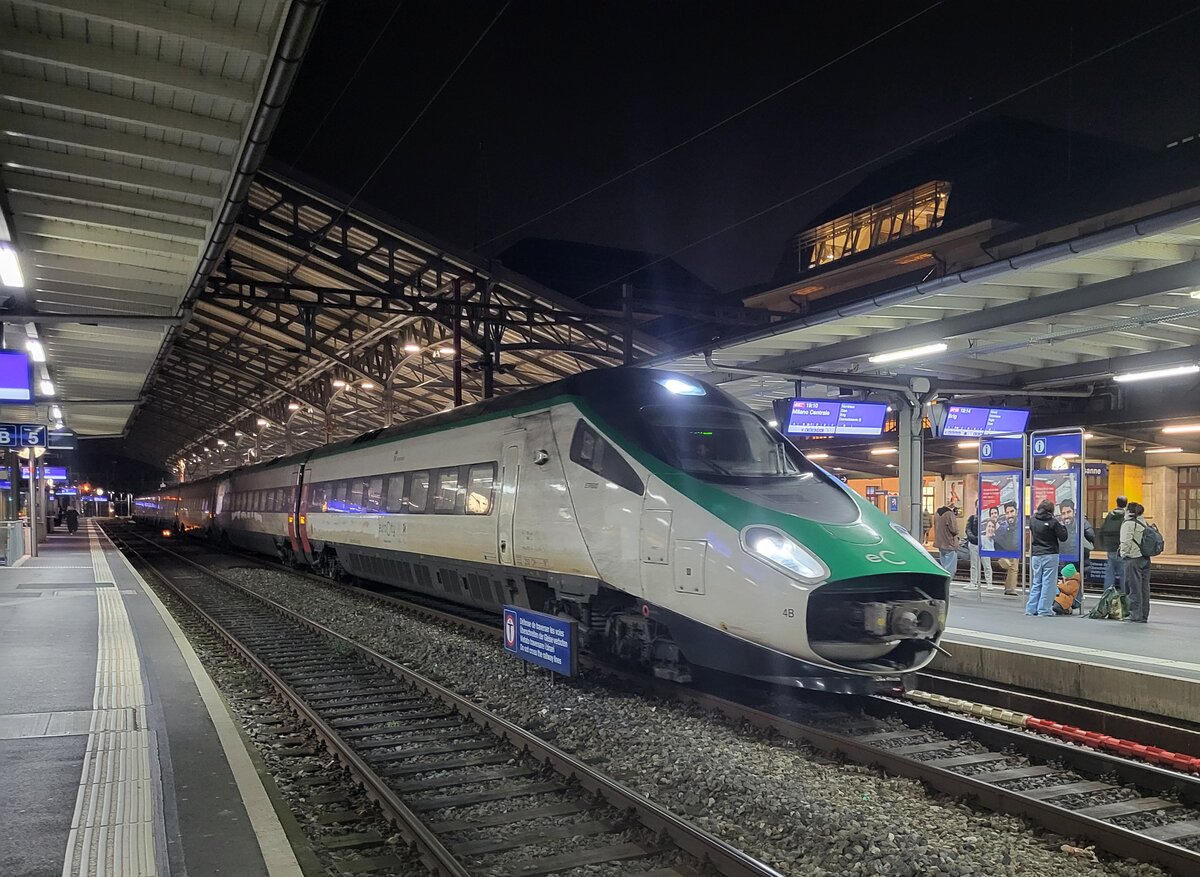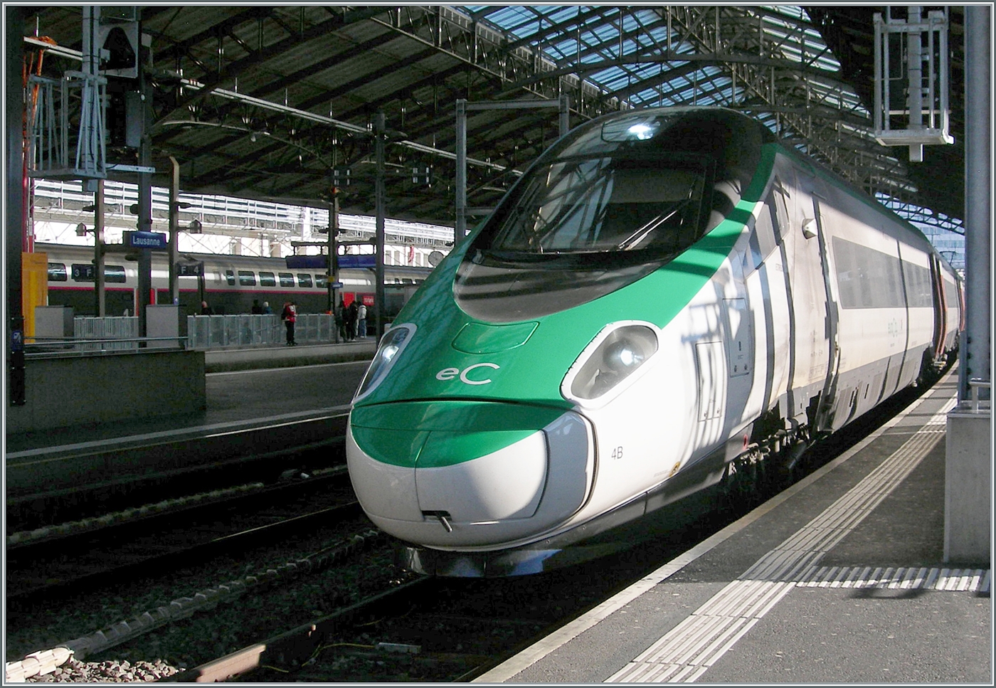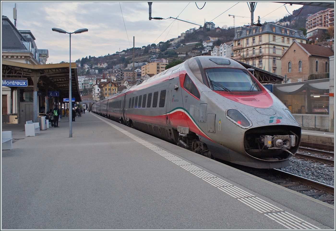 Ein FS Trenitalia mit leider offener Bugklappe fährt als EC 32 (Milano - Genève) in Burier durch.