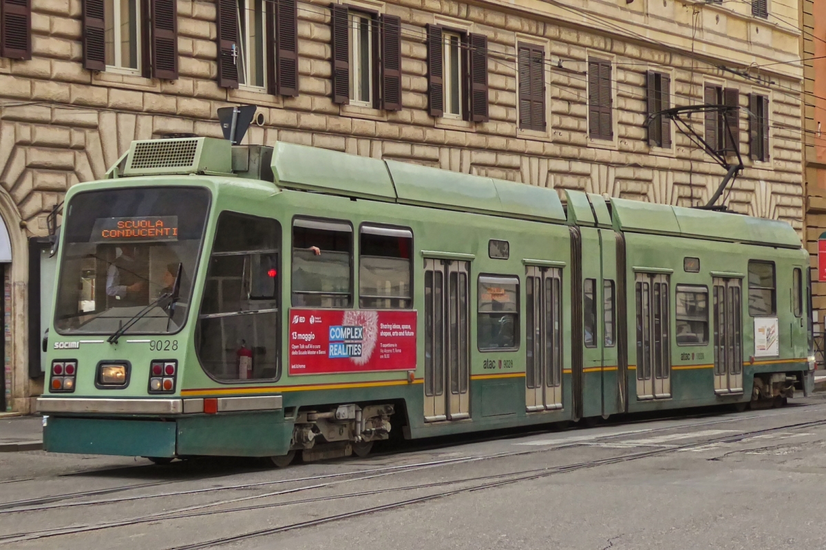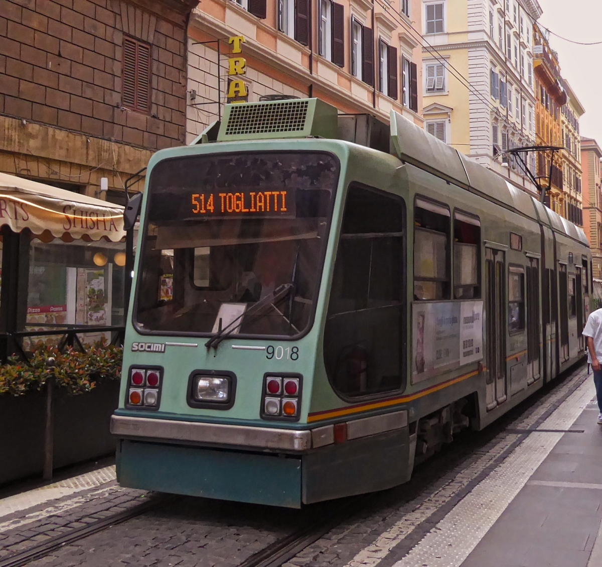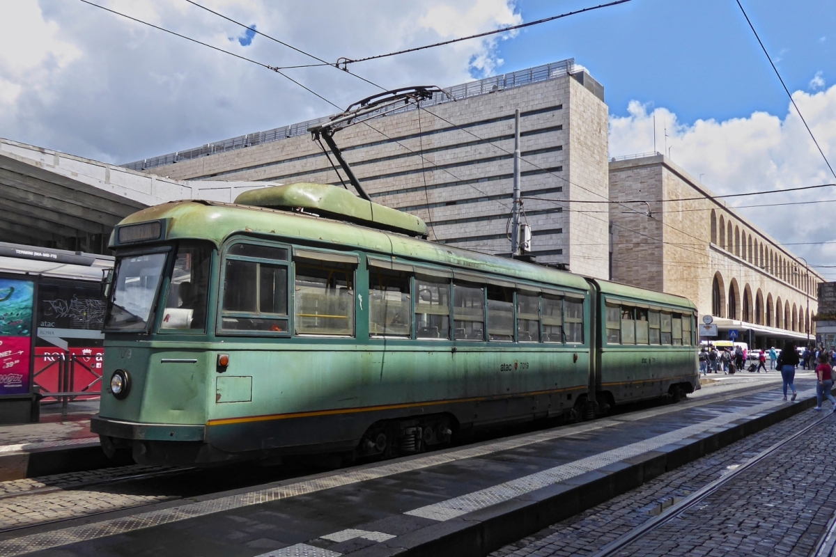 Oben erreicht am 13.07.2022 ein Trenitalia Frecciarossa 1000 (ETR 400) den Bahnhof Roma Termini, während unten der achtachsige fünfgliedrige Cityway I Gelenktriebwagen ATAC 9101 (Azienda per i Trasporti Autoferrotranviari del Comune di Roma) als Linie 3 bald die Zielstation Porta Maggiore erreicht.