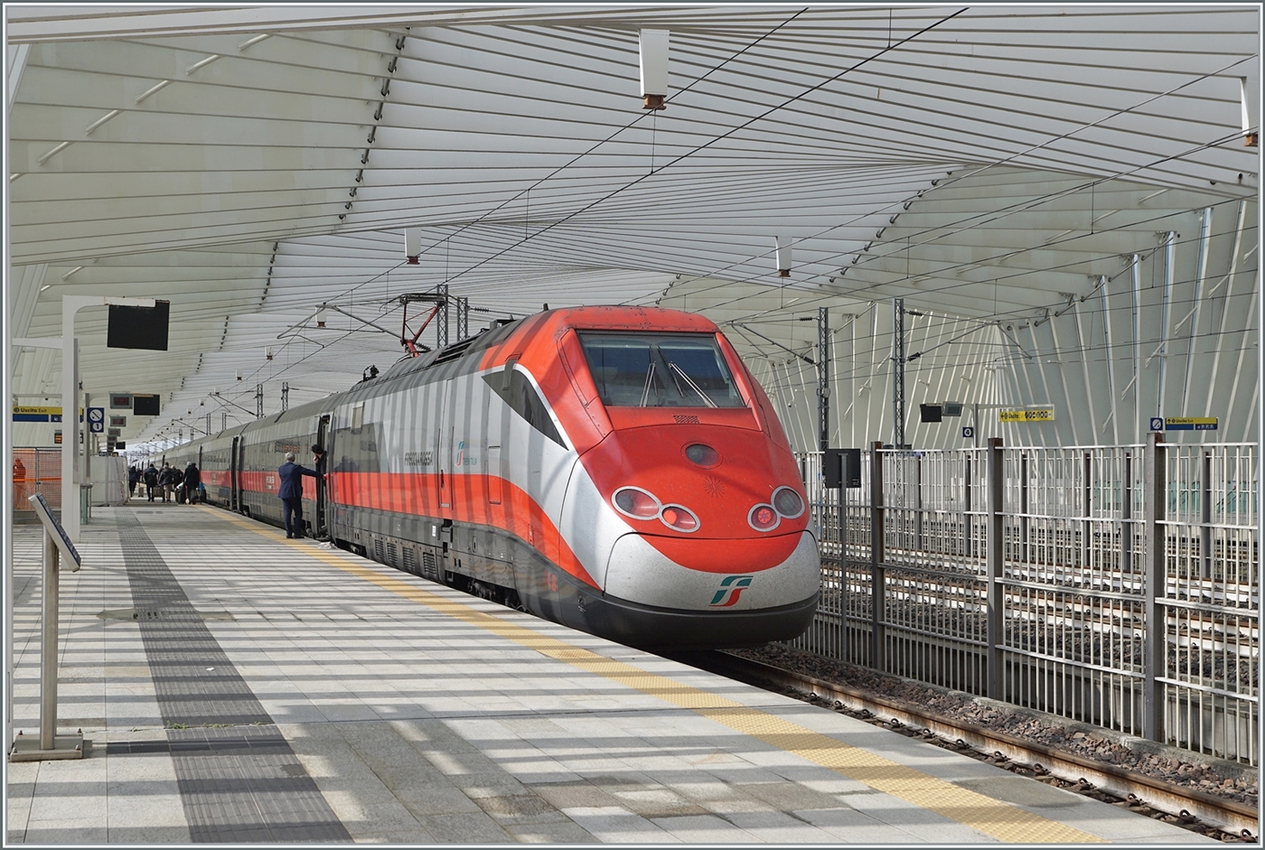 Ausfahrt eines sehr langen "Frecciarossa" (deutsch: roter Pfeil) der Trenitalia (100-prozentige Tochtergesellschaft der Ferrovie dello Stato) am 29.12.2015 vom Bahnhof Milano Centrale (Mailand Zentral). Der Frecciarossa ist eine Zuggattung für Züge mit einer Höchstgeschwindigkeit von 300 km/h. Hier ist es der ETR 500 - 56 ein ETR 500 der 2.Serie. ETR steht ElettroTreno Rapido.