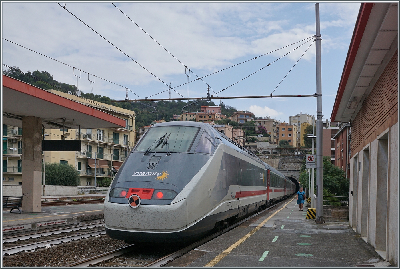 Der Frecciabianca ist eine Zuggattung für Züge mit einer Höchstgeschwindigkeit von 200 km/h (IC), die nur im italienischen Gleichspannungsnetz verkehren. Hier ist es die E.414 102-0 und eine weitere am anderen Ende mit vielen IC-Großraumwagen dazwischen.