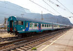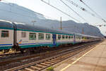 Vorne der 2. Klasse MDVC-Reisezug-Steuerwagen mit Gepäckabteil (MDVC steht für Medie Distanze Vestiboli Centrali, deutsch für Mittlere Entfernungen in Ballungsräumen) 50 83 82-86 807-5 I-TI der Trenitalia, der Gattung npBD und Bauart APR ("Hasenkasten"-Steuerwagen) .