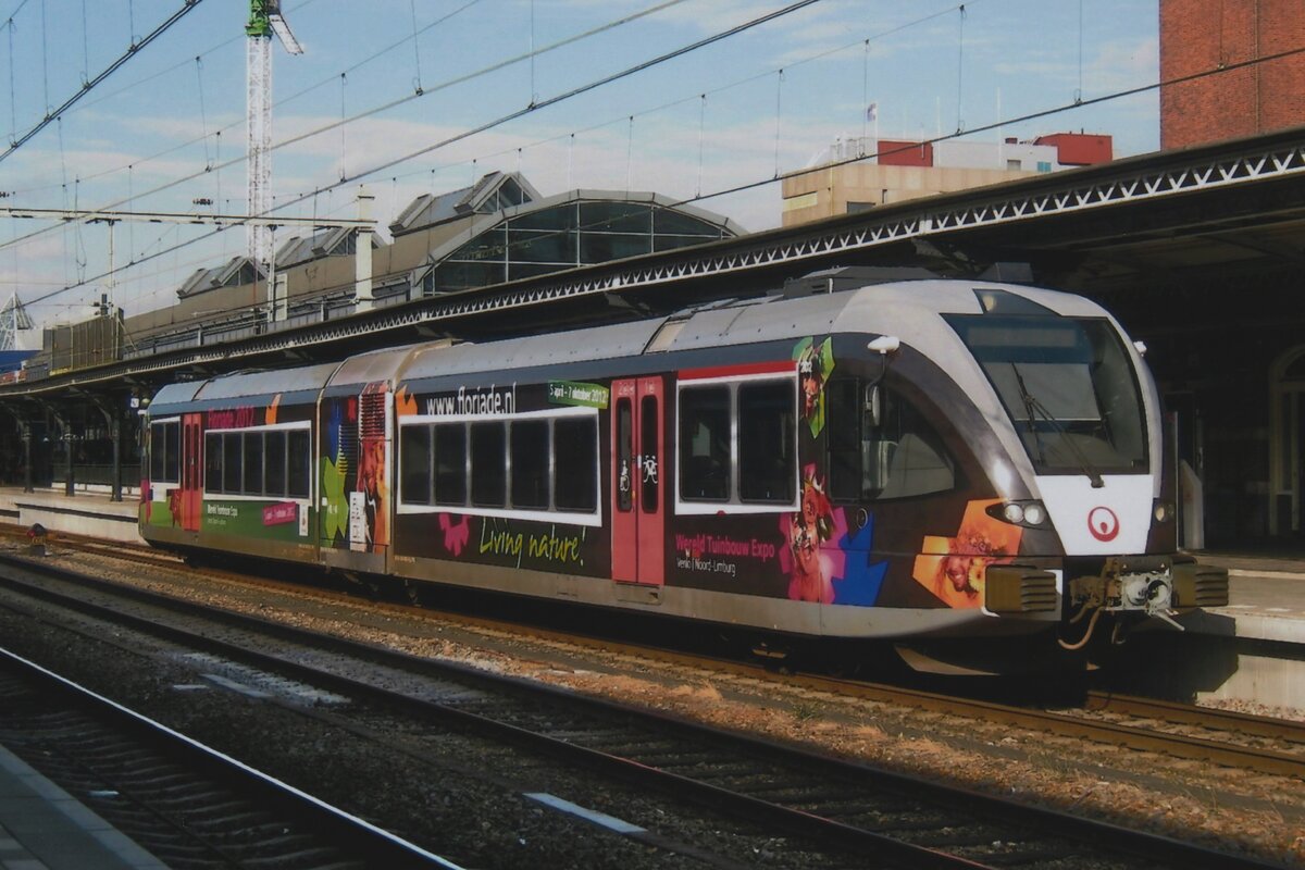 Veolia 202 steht mit Vollwerbung für "Floriade 2012" am 4 Augustus 2012 in Nijmegen. Jede zehn Jahre gab es diese Gartenschau in die Niederlände -bis 2022, wann die letzte Floriade in Aalsmeer eine Defizit von etwa 50 Millionen Euros aufwies, und damit die Floriadetradition beendete. Leon Schrijvers