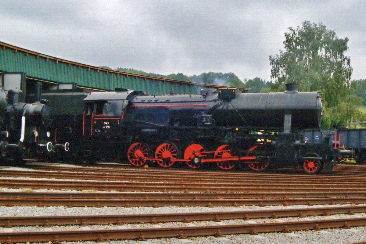 Fotoguterzug mit 52 3879 steht am 4 September 2007 in Beekbergen bei das VSM-Festival Terug naar Toen (Zurück ins Damals). Die Lok tragt das ex-BBÖ-Farbenschema.