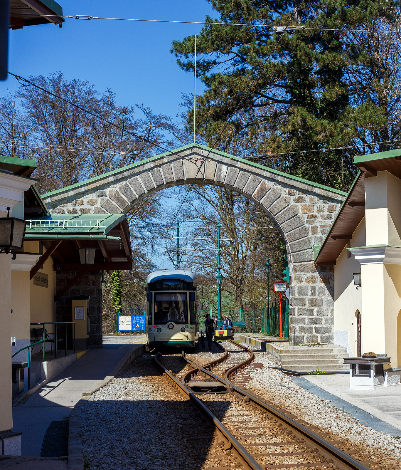 Der Triebwagen 023 ein siebenteiliger Niederflur-Straßenbahn-Einrichtungswagen vom Typ Bombardier Cityrunner der ersten Generation der Straßenbahn Linz/Donau (A), betrieben durch die Linz Linien GmbH, als Linie 2 von der Universität nach solarCity, hat am 04. April 2025 gerade die Donau überquert und erreicht als bald die Haltestelle Hauptplatz Linz.