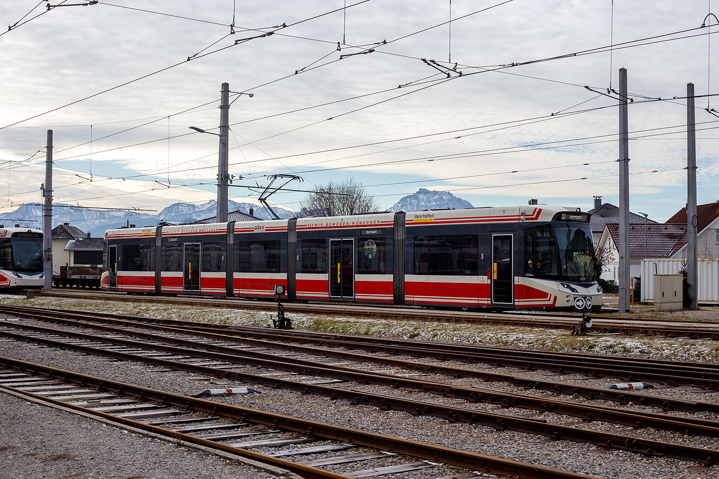 Ein ehemaliger Schweizer, der Buffetwagen mit zwei Plattformen B4bu 20.225 „Traunsteinbar“ der Stern & Hafferl Verkehrsgesellschaft m.b.H. (StH), Lokalbahn Gmunden–Vorchdorf, ist am 14 Januar 2025 beim Bahnhof Vorchdorf-Eggenberg abgestellt.