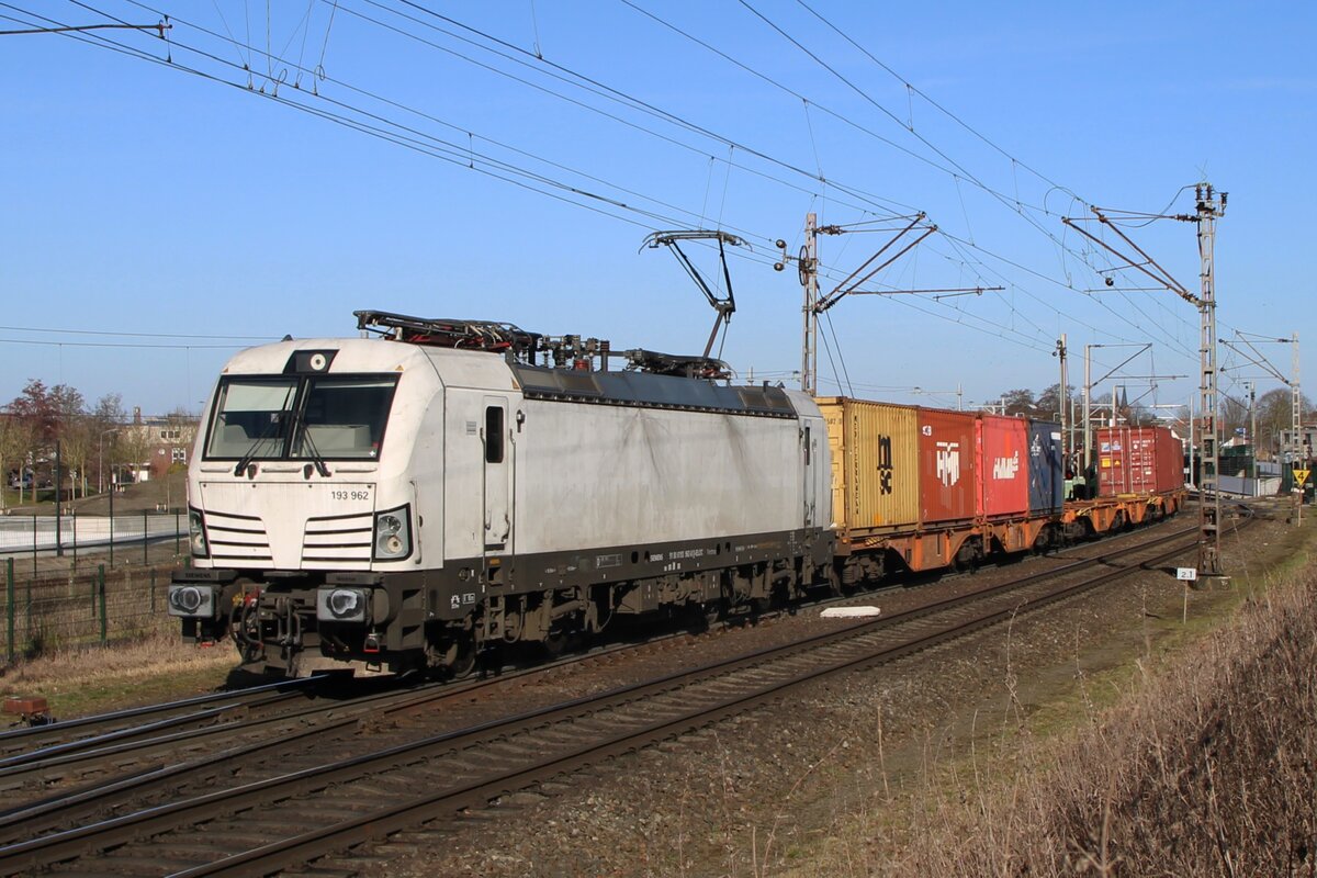 LTE 193 962 zieht ein Containerzug langs Venlo-Vierpaardjes am 7 Februar 2026.