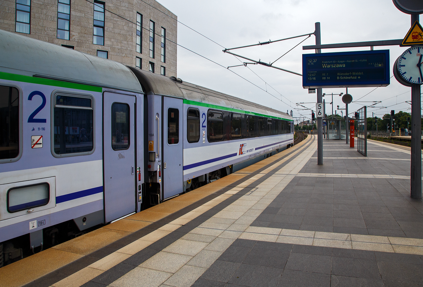 Der 2. Klasse klimatisierte Großraumwagen (Reisezugwagen) PL-PLKIC 61 51 29-90 020-0 der Gattung B9mnopuz (Typ 159 / Bdhmnu) der PKP Intercity, eingereiht als Wagen 267 in den „Berlin-Warszawa-Express“ EC 45 (DB) / EIC 71004 (PKPIC), am 24. Juni 2017 im Hbf Berlin.