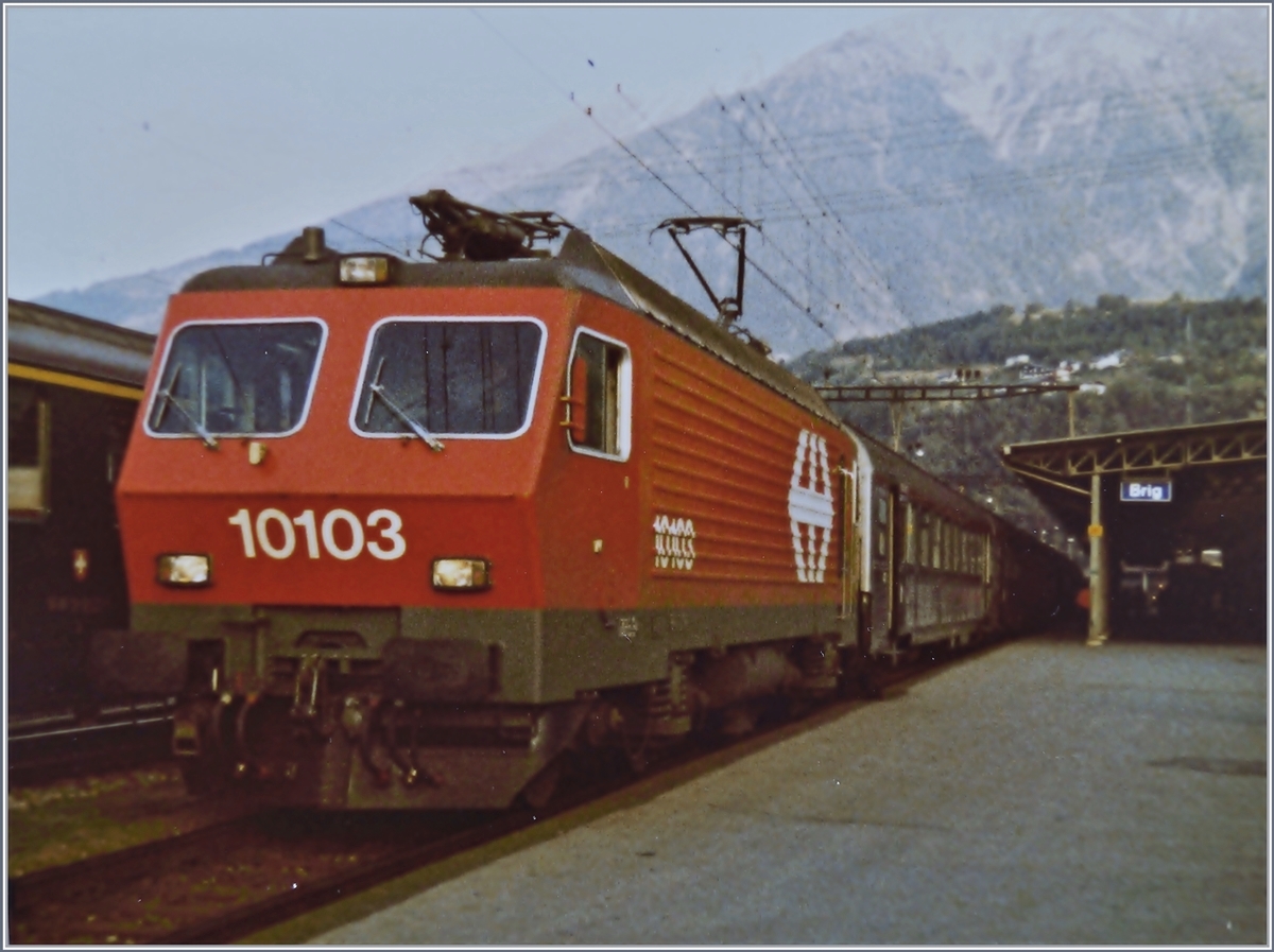 Re 4/4 IV 10103 "Luino" mit TEE 23 Cisalpin von Milano nach Paris beim Halt in Brig. Das Bild entstand mit einem 110-Film, welcher heutigen Qualitätsansprüchen kaum genügt, doch infolge des historischen Charakters des Motivs doch den einen oder andern ansprechen dürfte.