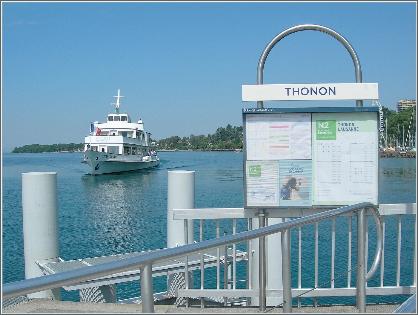 Das CGN Motorschiff  General Guisan  erreicht von Lausanne kommend Thonon (F).