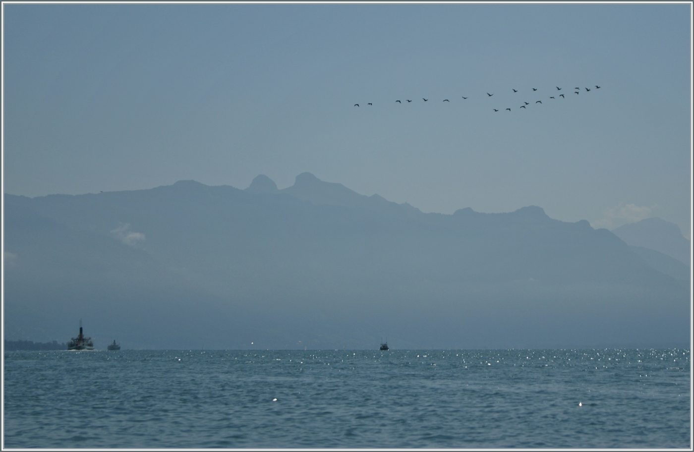 Ein Schiffbild der etwas anderen Art: während links im Bild in der Ferne gleich zwei Schauffelraddampfer zu sehen sind fliegen recht oben etliche Kormorane in Formation Richtung Westen.