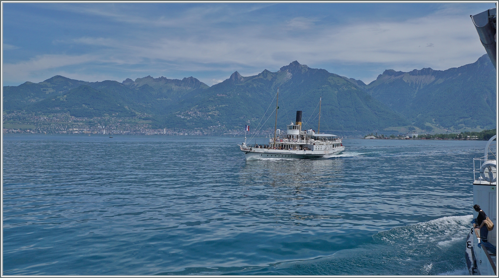 Das Dampfschiff  La Suisse  mit welchem ich eine Rundfahrt geniesse begegnet zwischen Bouveret und St-Gingolph dem Dampfschiff  Vevey .