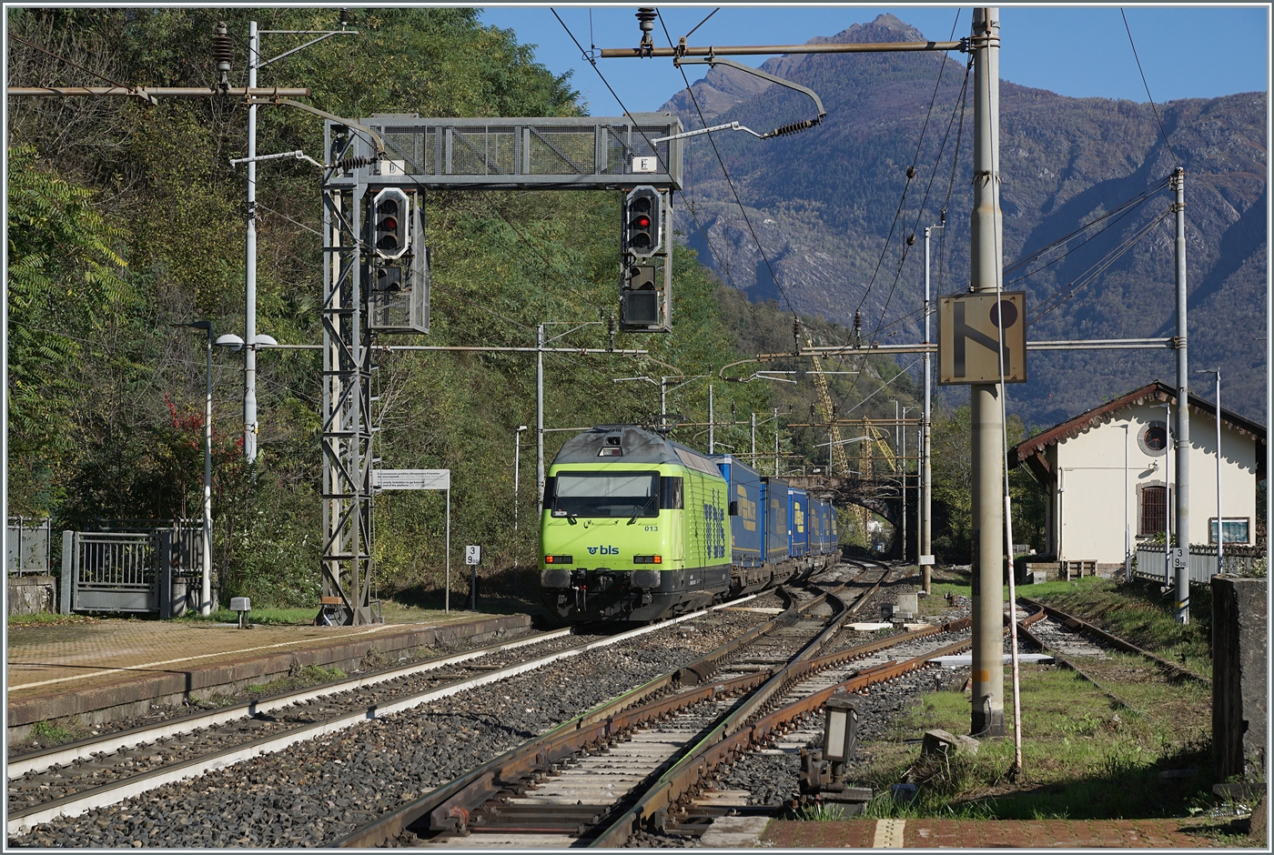 Die BLS Re 465 008 und eine BLS Re 475 verlassen mit einem Güterzug den Bahnhof von Brig.
