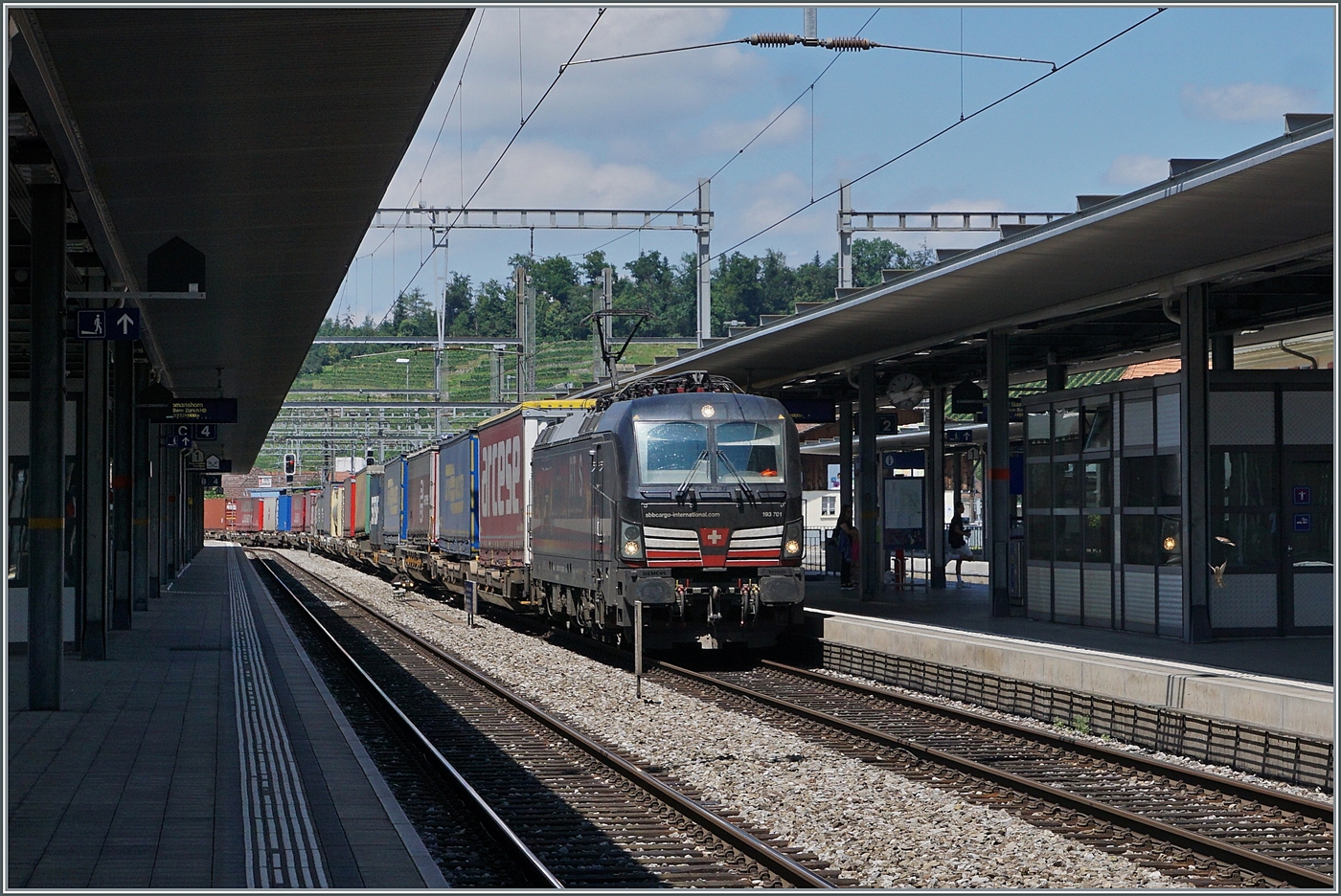Ganz neu ist die SBB Cargo 193 063. Mit ihrem Güterzug wartet die Lok in Vevey auf die Weiterfahrt.
