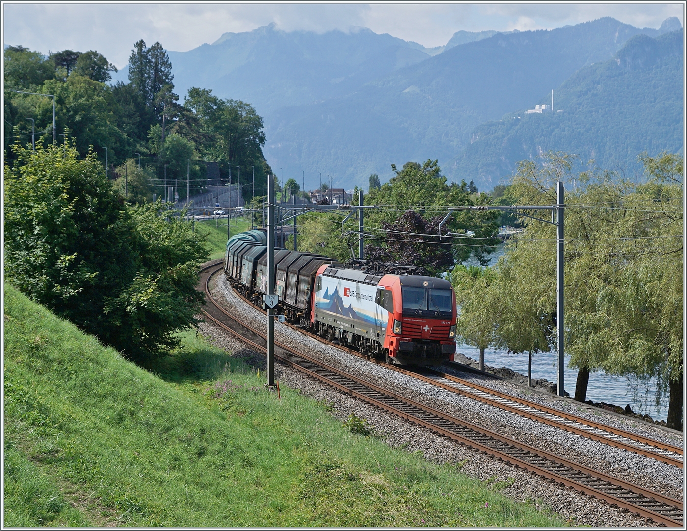 Ebenfals bei Villeneuve, aber aus der Gegenrichtung zeigt sich die SBB Cargo International 193 470 mit dem Novelis Güterzug von Sierre nach Göttingen, womit wohl diese Liestung wieder von der DB auf die SBB übergegangen ist.