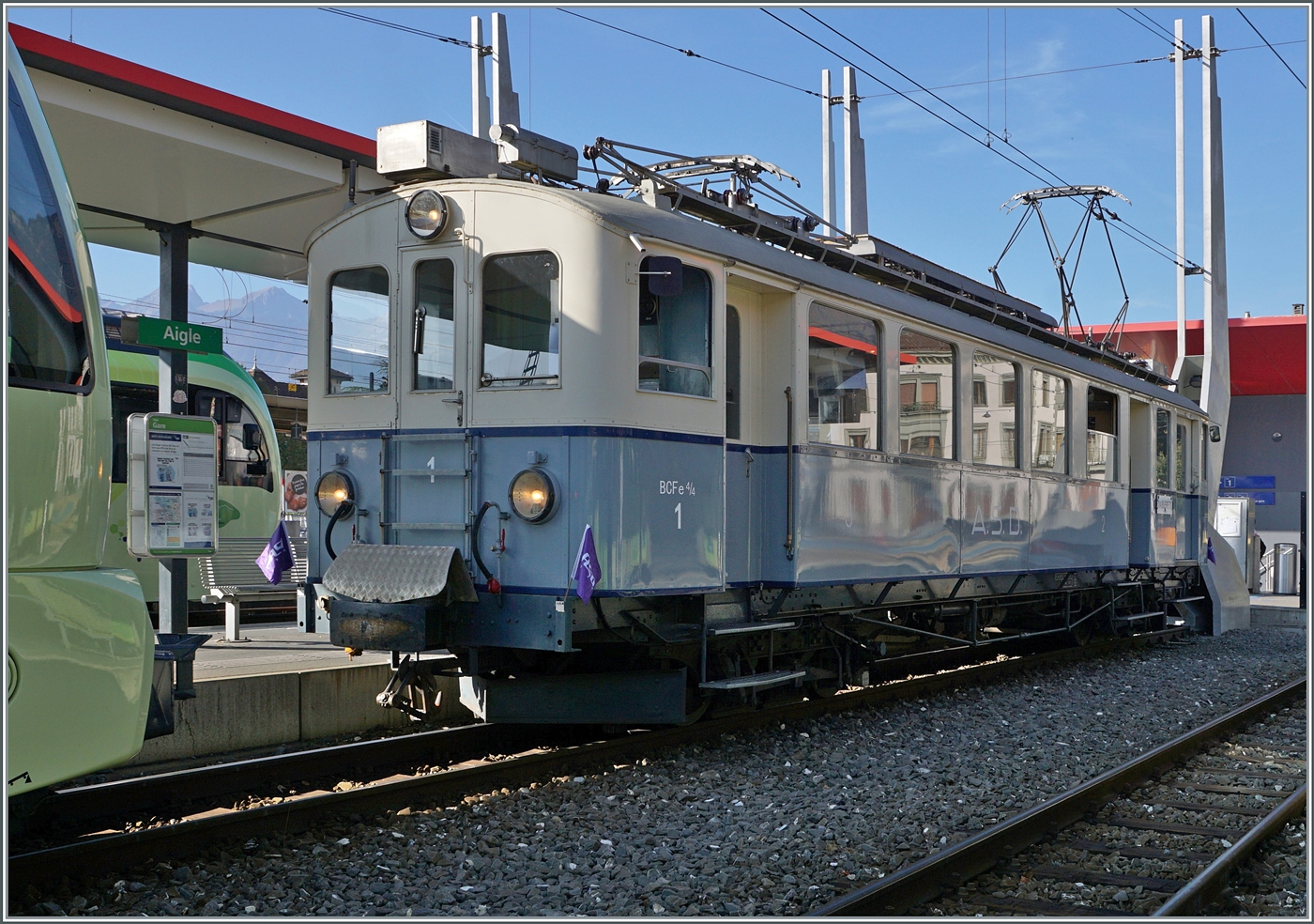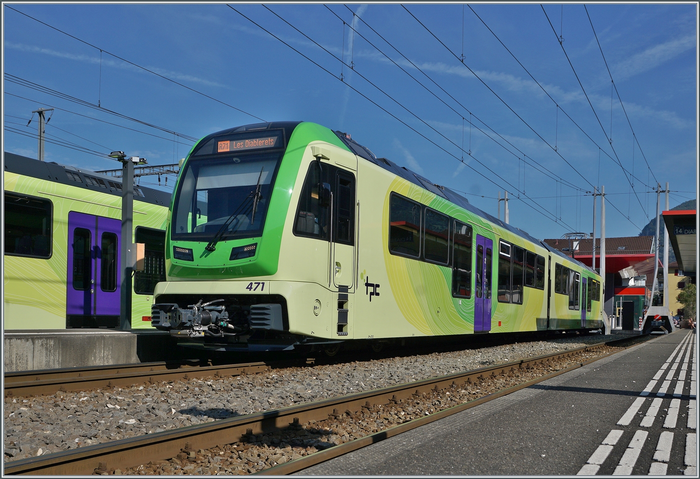 Der TPC Beh 2/6 wartet auf die Abfahrt nach Champéry, der neue ABe 4/8 471 wird nach Les Diablerets fahren und im Hintergrund steht ein A-L Regionalzug R70 nach Leysin.