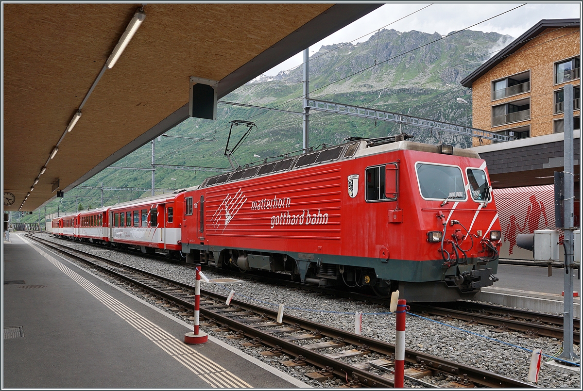 Die von der FO 1977 bestellte Ge 4/4 81 "Wallis" in Andermatt beim Manöver mit Auto Tunnel- Wagen.
