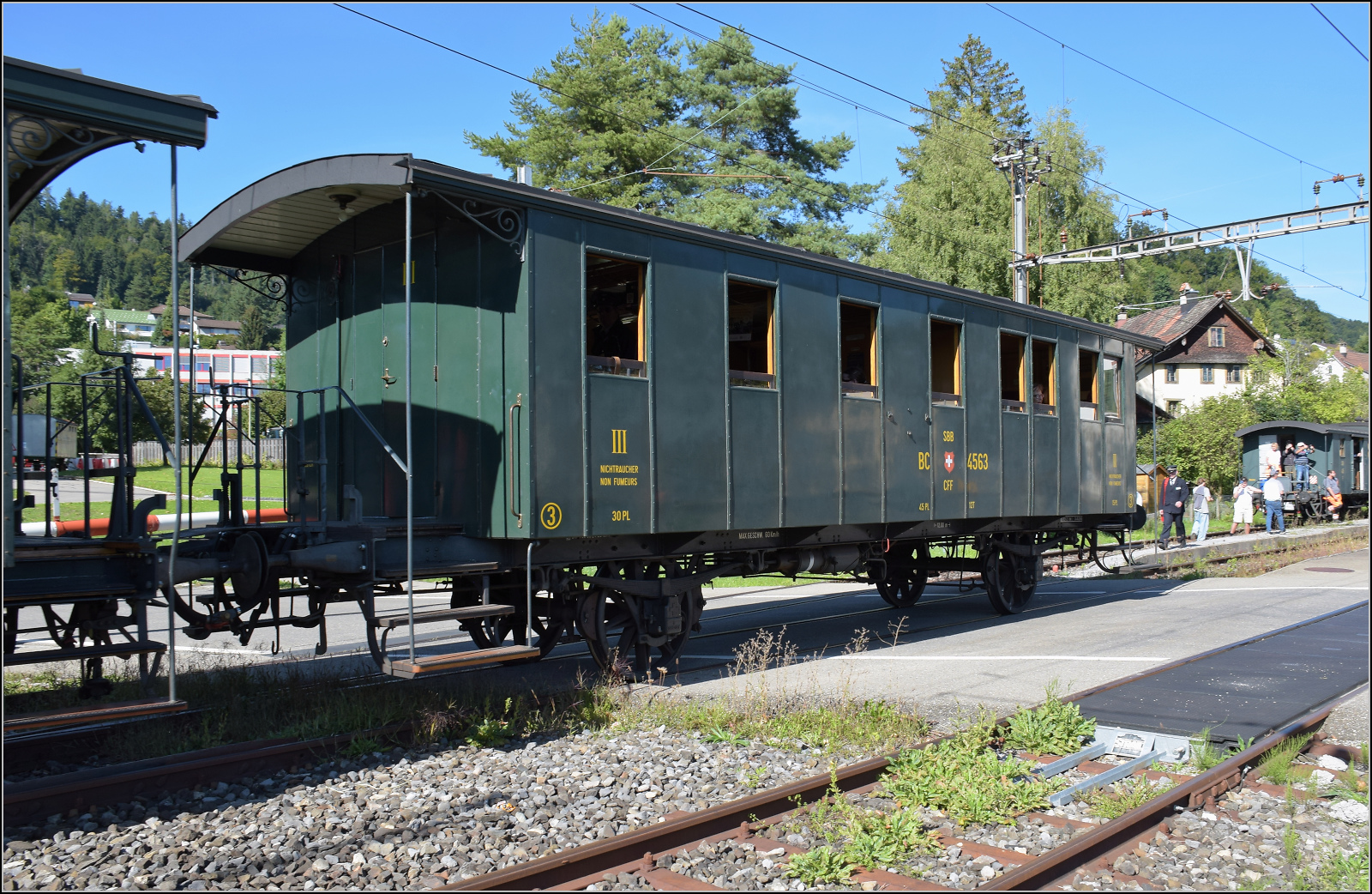 "Le Chablais en fête" bei der Blonay Chamby Bahn. Die Eröffnung des ersten Teilstückes der Bex - Villars vor 125 Jahren, sowie die vor 80 Jahren erfolgte Fusion einiger Strecken im Chablais war der Anlass zum diesjährigen Herbstfestivals "Le Chablais en fête. Als besondere Attraktion zeigt sich der ASD BCFe 4/4 N° 1 "TransOrmonan" der TPC mit seinem B 35 als Gastfahrzeug. Das Bild zeigt den 1913 gebauten und 1940 umgebauten BCFe 4/4 N° 1 beim Rangieren in Blonay.