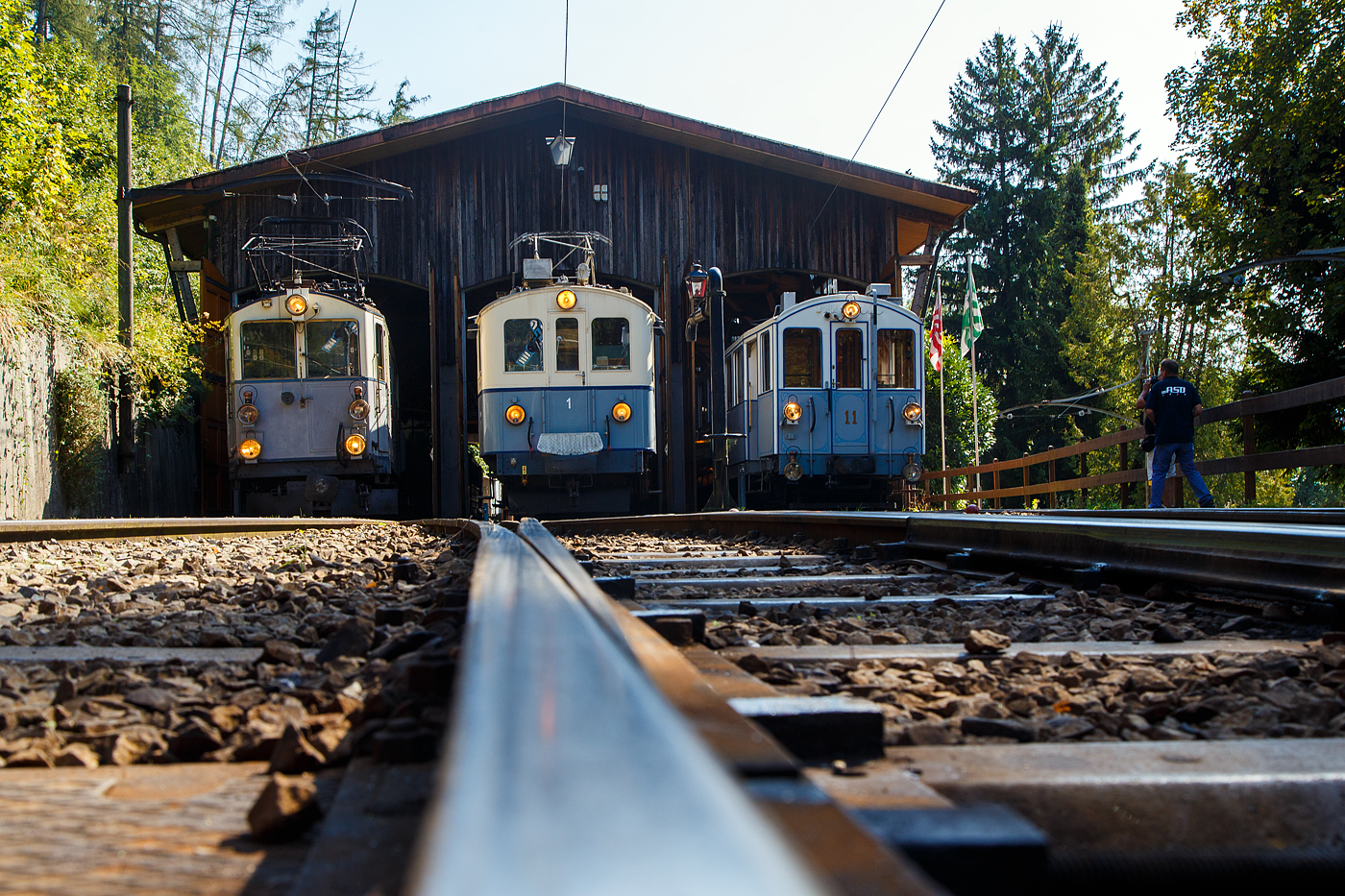 "Le Chablais en fête" bei der Blonay Chamby Bahn. Die Eröffnung des ersten Teilstückes der Bex - Villars Bahn vor 125 Jahren, sowie die vor 80 Jahren erfolgte Fusion einiger Strecken im Chablais waren der Anlass zum diesjährigen Herbstfestivals "Le Chablais en fête. Nachdem Genuss der überraschenden Fahrzeugparade (siehe ID 824032) verlässt der ASD ABDe 4/4 N° 1 den Bahnhof von Chamby in Richtung Chaulin.