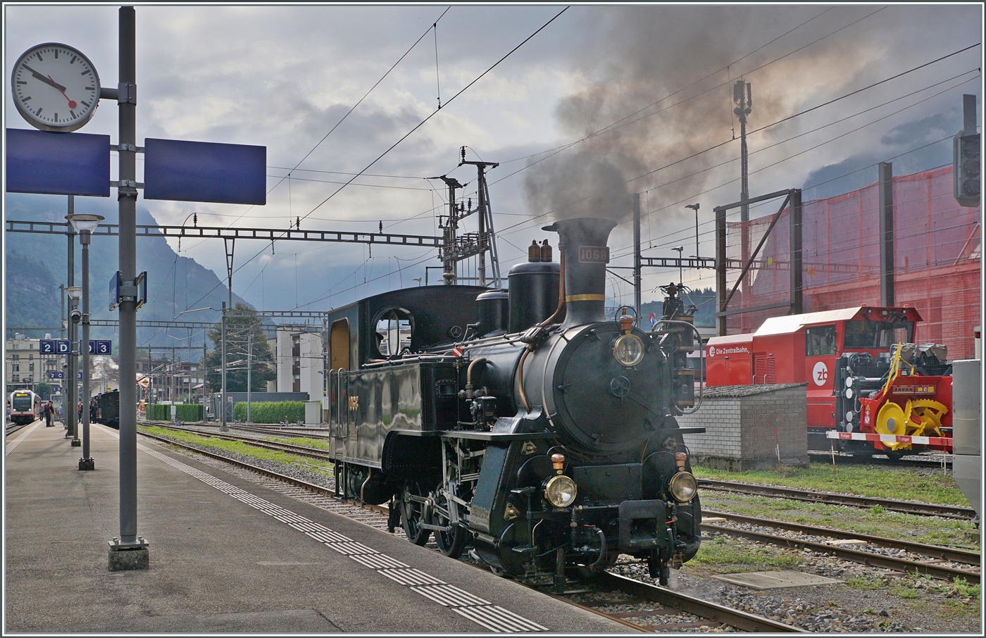 Lokwechsel! Und schon dampft die HG 3/3 1068 der der BDB (Brünig Dampf Bahn) heran um den Zug für die Bergfahrt zu übernehmen. Die HG 3/3 1068 ist die aller letzte an die SBB ausgelieferte Dampflok. Sie wurde von der SLM unter der Fabriknummer 3134 im Jahre 1926 an die Brünigbahn übergeben. Nun, nach der officiel aller letzten Dampflok folgt gut zwanzig Jahre später die (wahrscheinlich wirklich) aller letzte SBB Dampflok: der Nachbau der D 1/3 "Limmat" von der SLM/Fabriknummer 3937 unter der Verwendung der SCB Eb 2/4 "Spicher" und Mithilfe der SBB Hauptwerkstätte. Heute ist die D 1/3 mit der UIC Nummer 90 85 0000 001-7 in der Obhut von SBB Historic. 23. Aug. 2025