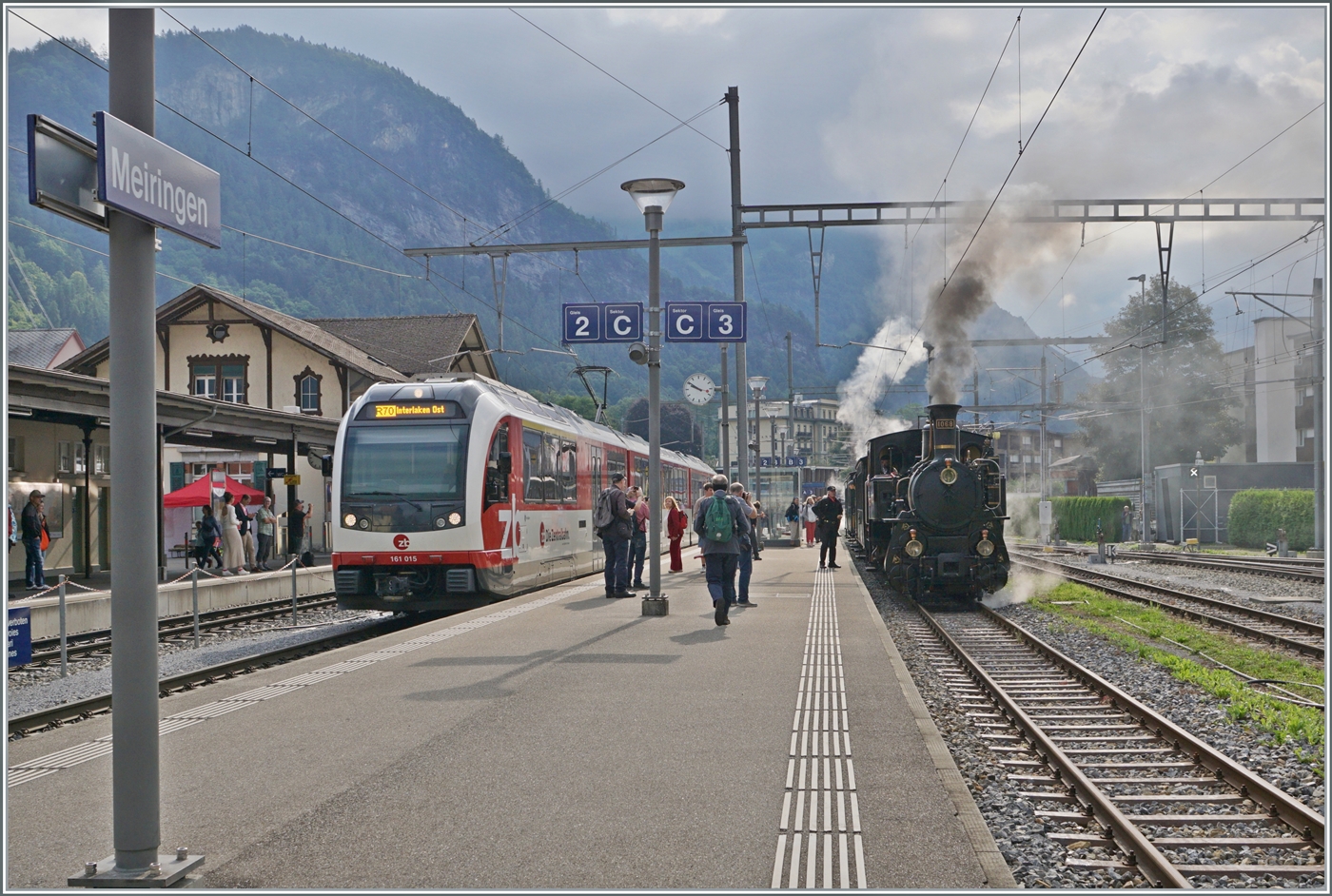 Zurecht zieht die HG 3/3 1068 der BDB (Brünig Dampf Bahn) interessierte Blicke auf sich, während auf dem Nebengleis der zb  Fink  ABeh  161 015 als R71 auf die baldige Abfahrt nach Interlaken Ost wartet.