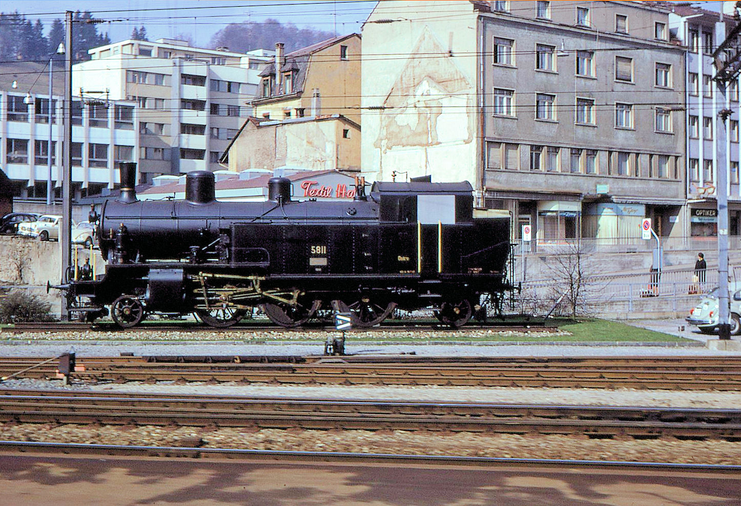 Nachdem die noch vorhandenen Eb 3/5 von 1911-1916 (5801-5834) gewürdigt worden sind, nämlich 5810 und 5819, soll noch an drei weitere Lok erinnert werden. Hier steht 5811 als Denkmal in Baden, 25.März 1970.