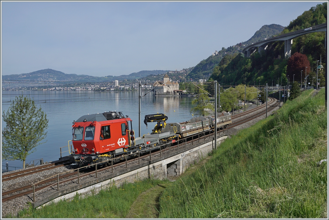 Der SBB Infrastruktur "Dart" (Windhoff) Tm 234 431-5 ist kurz nach der Haltestelle Veytaux Chillon auf dem Weg in Richtung Villeneuve.