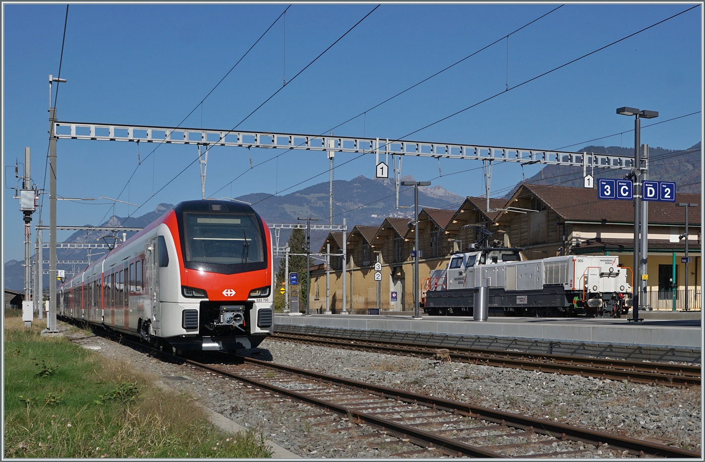 Die Sersa Group Am 843 151 TRUDY (UIC 98 85 5843 151-2 CH-SERSA) wartet in Vevey mit einem Gleisbauzug auf die Weiterfahrt.