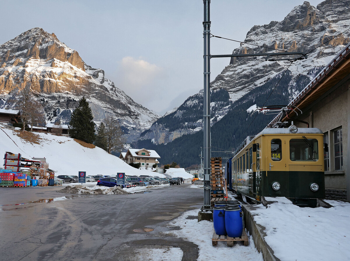 Ein Blick auf den WAB Güterumschlagplatz von Lauterbrunnen mit dem WAB BDeh 4/4 115 beim Güterschuppen und des etwas verdeckten He 2/2 32.