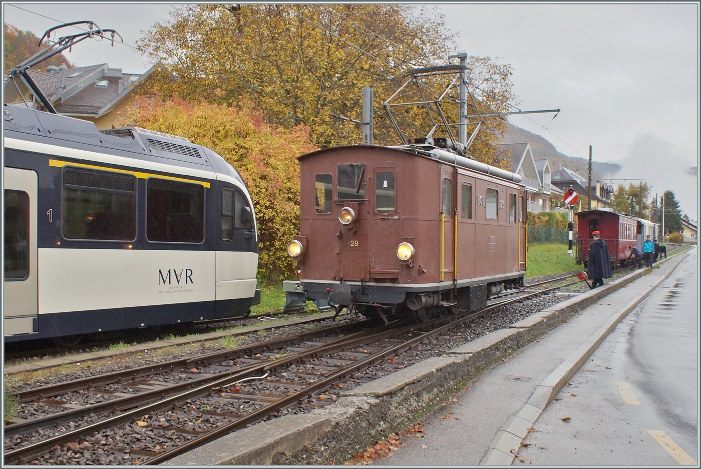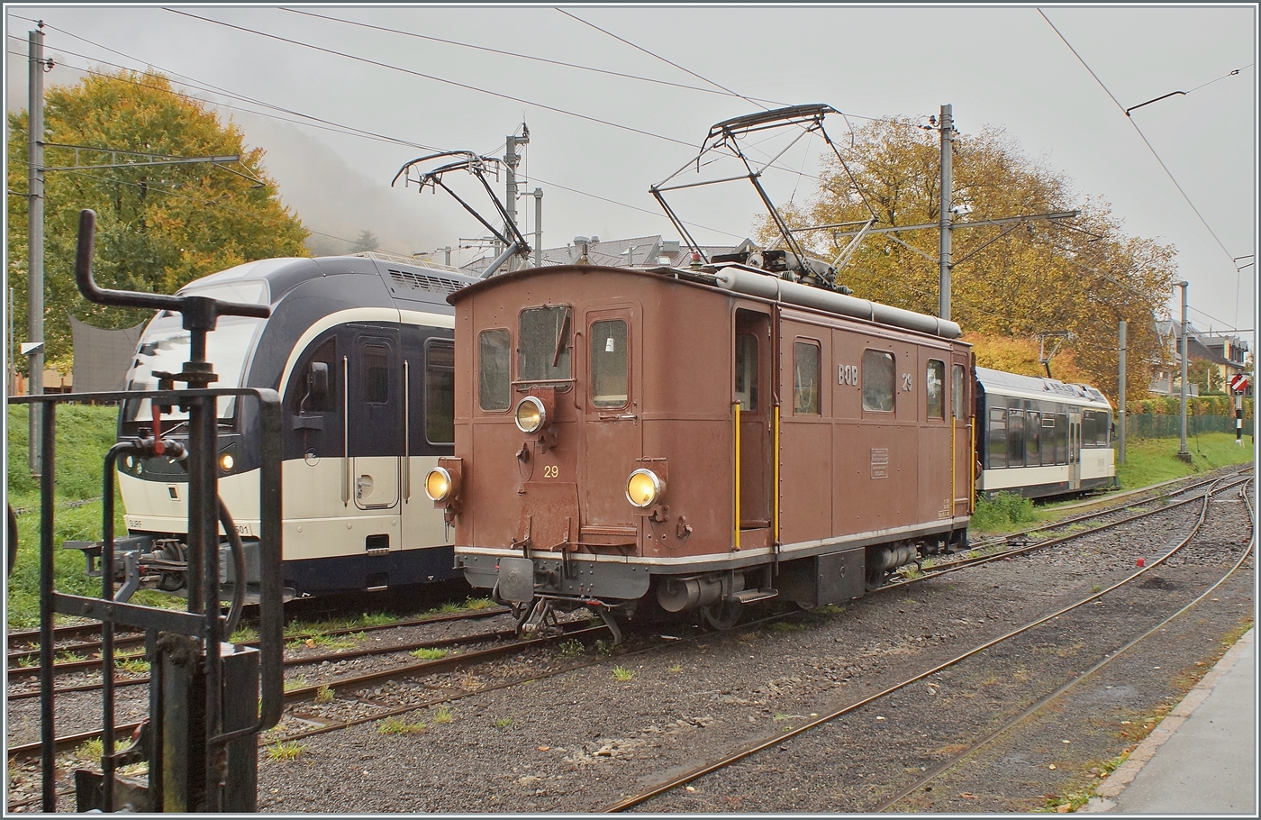 La DER de la Saison / Das Saison Ende der Blonay Chamby Bahn 2025 - Seit einigen Jahren zeigt die Blonay Chamby Bahn zum Saison Ende mit einem verdichteten Fahrplan noch einmal ihre herrlichen Fahrzeuge im Einsatz: Trotz des eher "schwierigen" Wetters konnte ich es mir nicht verkneifen, doch noch beim neu restaurierten Viadukt ein paar Herbstbilder zum Saisonabschluss zu machen. Die BOB HGe 3/3 29 der Blonay - Chamby Bahn ist mit ihrem Personenzug 2962 auf der Fahrt von Chaulin nach Blonay und fährt über den Baye de Clarens Viadukt.