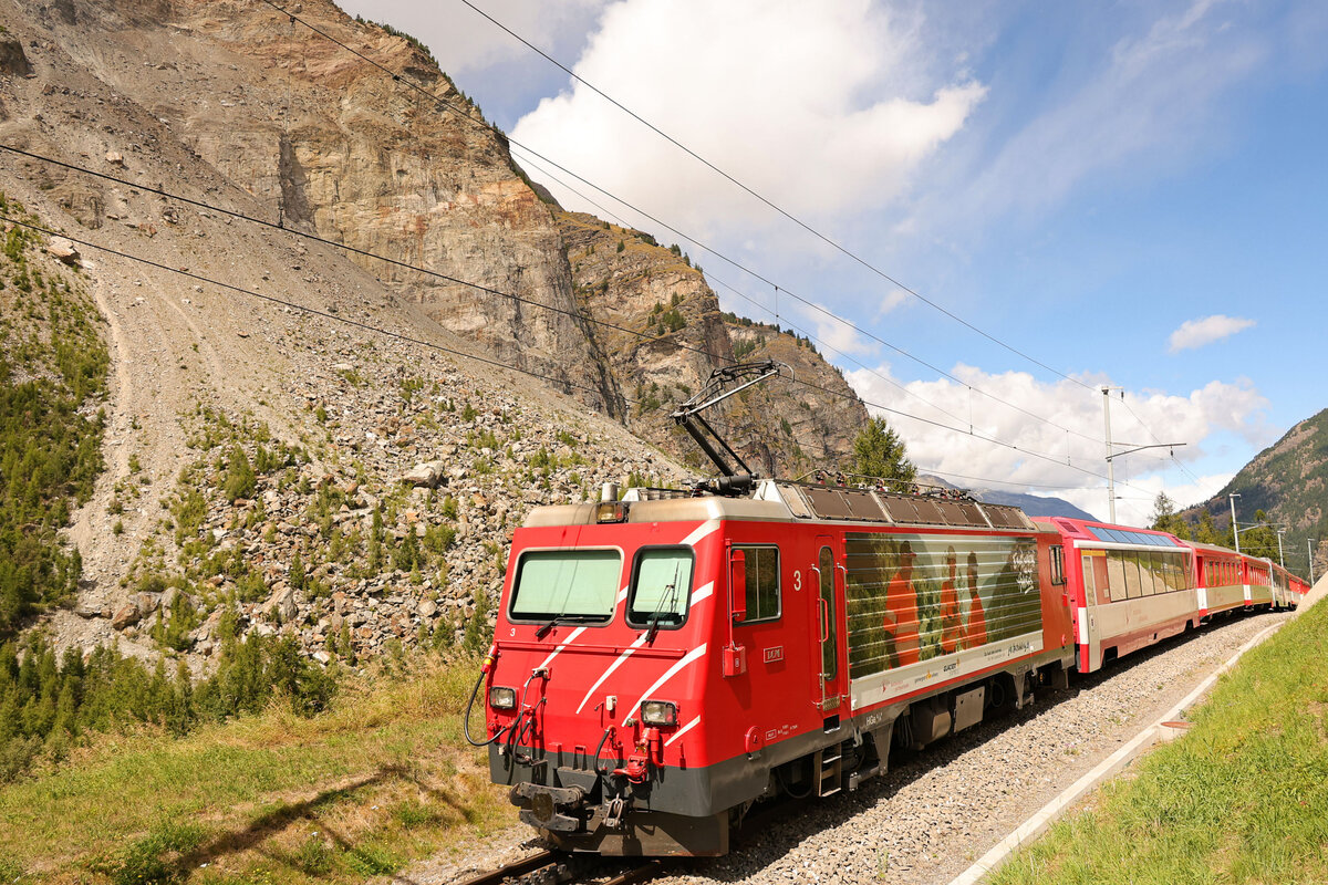 Stalden, MGB: Lok 3 (ehemals Brig-Visp-Zermatt Bahn BVZ) erklimmt die Steilrampe aus dem Tal nach Stalden. 30.August 2025